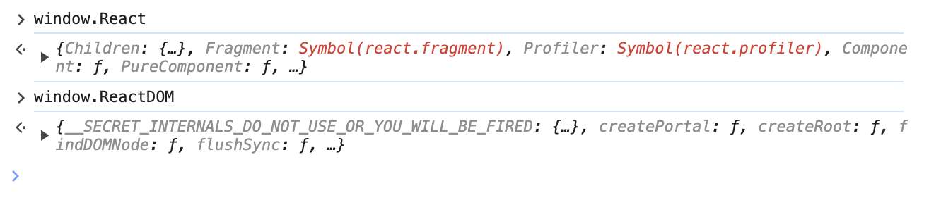 Also, we can check in console React and ReactDOM is properly assigned to global object